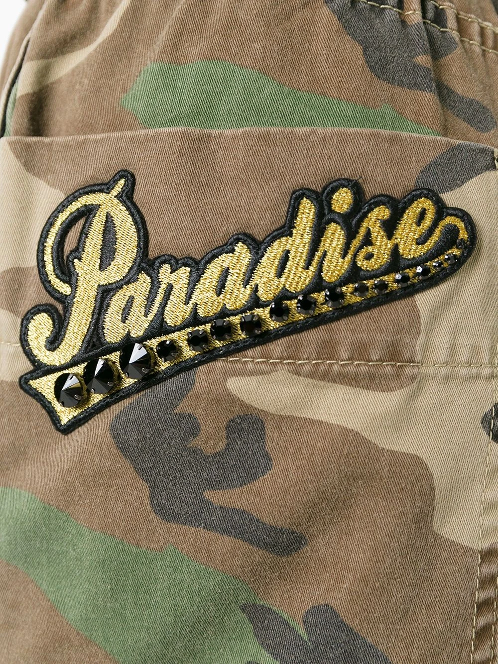 Green, black and brown cotton camouflage print belted trousers from Marc Jacobs featuring a high rise, an elasticated waistband, a side zip fastening, ruthenium pyramid studs, sequin embroidery, two back patch pockets, a cropped length, zip cuffs, a front patch pocket and a multicolour Paradise patch.